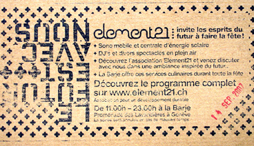 Testez nos petits chocolats et sucres Slogan. (texte à manger après lecture) Découvrez l’atelier nomade solaire, une action element21 présenté par nomadgency.com. Participez à Info-futur, votre avis nous intéresse ! (tirage au sort pour les participants. Vous pouvez gagner une soirée culinaire pour deux personnes à Genève)